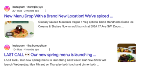 A Google Search for new restaurant menus generated a list of results, including Instagram posts.